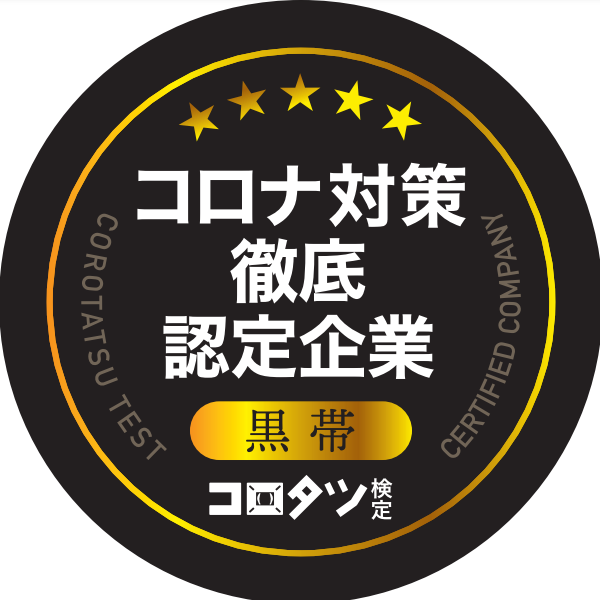 2021年4月26日に、アイグッズ株式会社様が実施する「コロタツ検定」において「黒帯」を取得しました。コロタツ検定とは、企業の新型コロナウイルスの感染対策に対する取り組みの度合いを示す判定基準で、当社が取得した「黒帯」は、最も高いレベルで対策をおこなう企業へ付与される最上位級です。